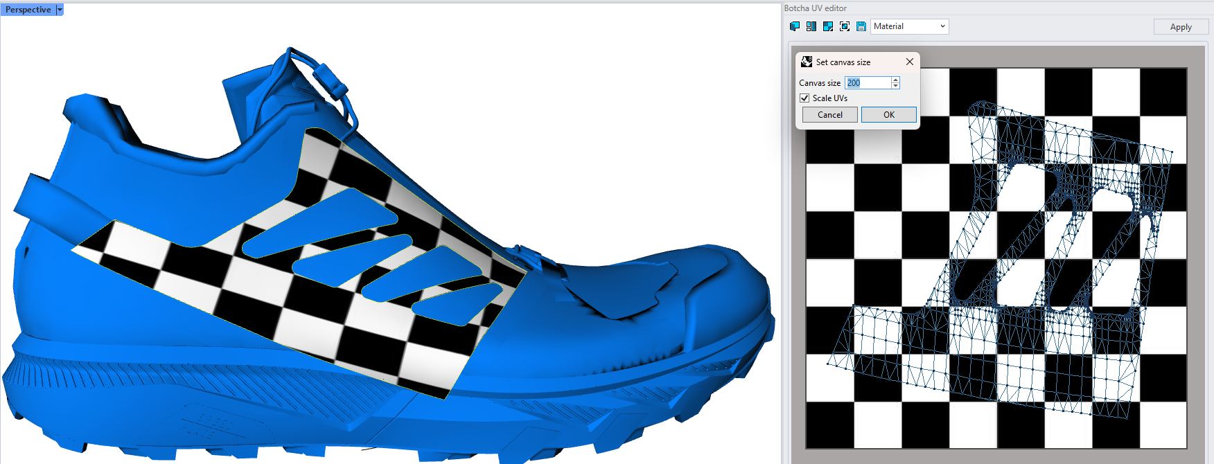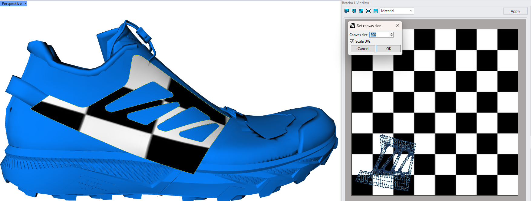 Jumping between the two mapping (heel and vamp) and 3D and 2D allow you to quickly achieve great results with very clean geometry.